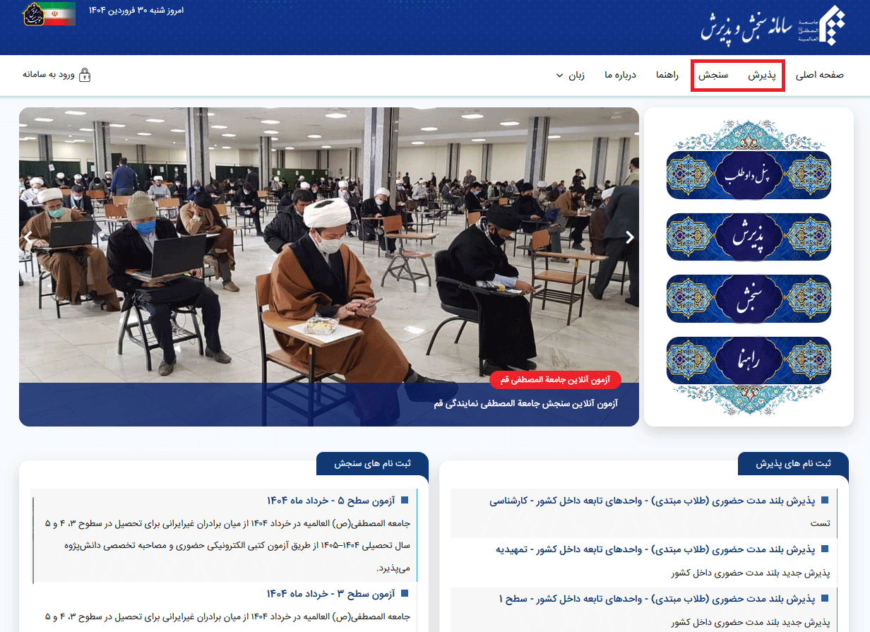 مرحله 1 : ابتدا در صفحه اصلی سامانه با توجه به نوع ثبت خود روی منوی مربوطه کلیک کنید. در قسمت پذیرش می توانید برای ثبت نام طلاب جدید الورود اقدام کنید اما در قسمت سنجش جهت ثبت نام آزمون های تحصیلات تکمیلی اقدام کنید.