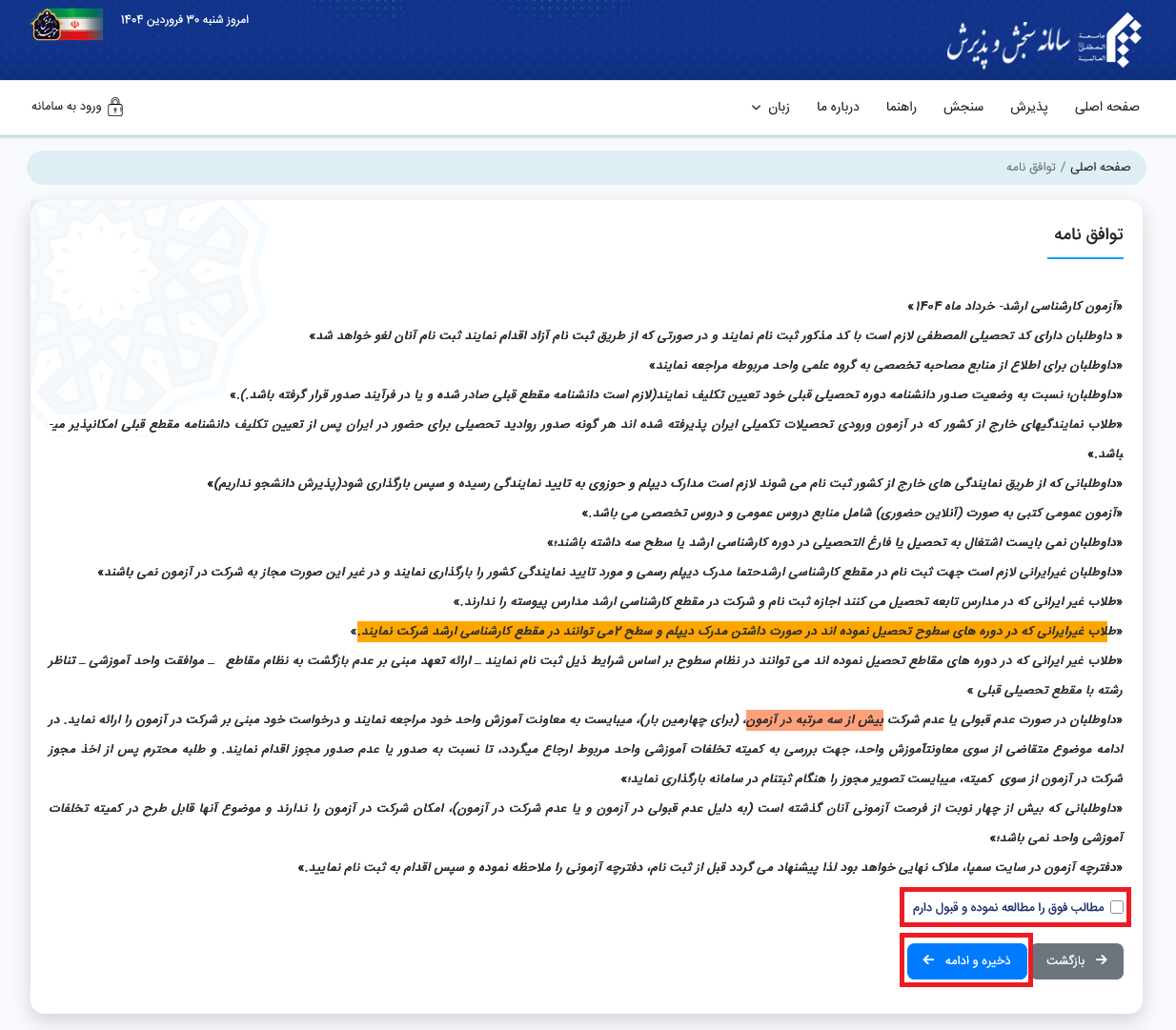 مرحله 4 : متن توافق نامه و قوانین مربوطه را با دقت مطالعه نموده و گزینه مطالب فوق رو مطالعه نموده و قبول دارم را علامت دار کنید. سپس روی گزینه ذخیره و ادامه کلیک کنید.