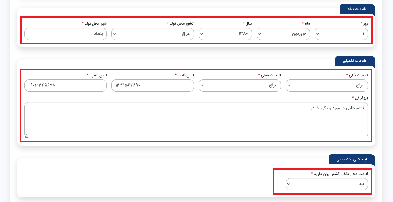 مرحله 6 : در این قسمت اطلاعات تولد، اطلاعات تکمیلی و فیلد های اختصاصی را با دقت وارد کنید.