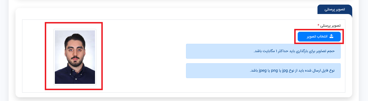 مرحله 7 : در این قسمت باید یک عکس پرسنلی مناسب از خود وارد کنید. تاکید می گردد از این قسمت فقط برای عکس پرسنلی خود استفاده کنید و به هیچ وجه مدارک خود را دراین قسمت بارگذاری نکنید.