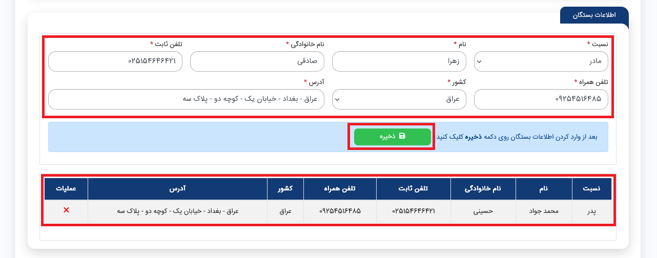 مرحله 8 : در این قسمت باید اطلاعات بستگان خود را وارد کنید. پس از وارد کردن اطلاعات هر یک از بستگان روی گزینه ذخیره اطلاعات کلیک کنید.