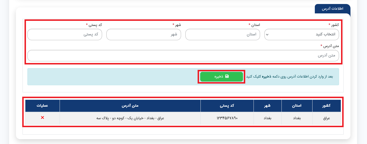 مرحله 9 : در این قسمت باید اطلاعات آدرس خود را وارد کنید. پس از وارد کردن اطلاعات هر آدرس روی گزینه ذخیره اطلاعات کلیک کنید.