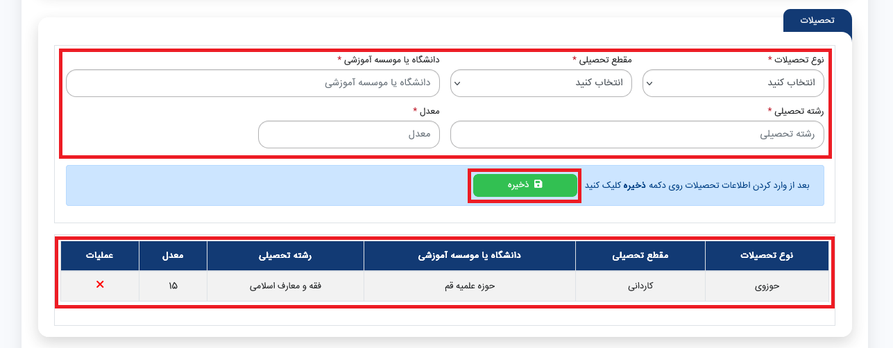 مرحله 11 : در این قسمت باید تحصیلات خود را وارد کنید. پس از وارد کردن اطلاعات هر یک از تحصیلات روی گزینه ذخیره اطلاعات کلیک کنید.
