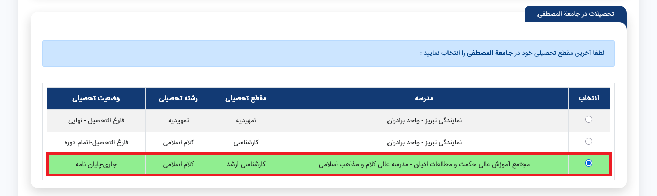 مرحله 12 : در صورتی که قبلا در جامعة المصطفی تحصیل کردهاید و نوع ثبت نام را ثبت نام با کد تحصیلی سجا انتخاب کردهاید، در این قسمت باید آخرین مقطع تحصیلی خود را با دقت انتخاب نمایید.
