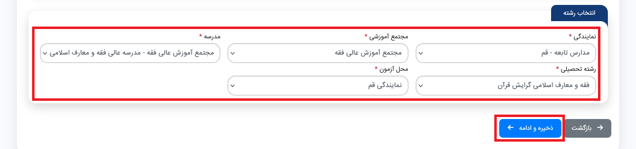 مرحله 13 : در این قسمت باید محل تحصیل، رشته تحصیلی و محل آزمون خود را انتخاب نمایید.