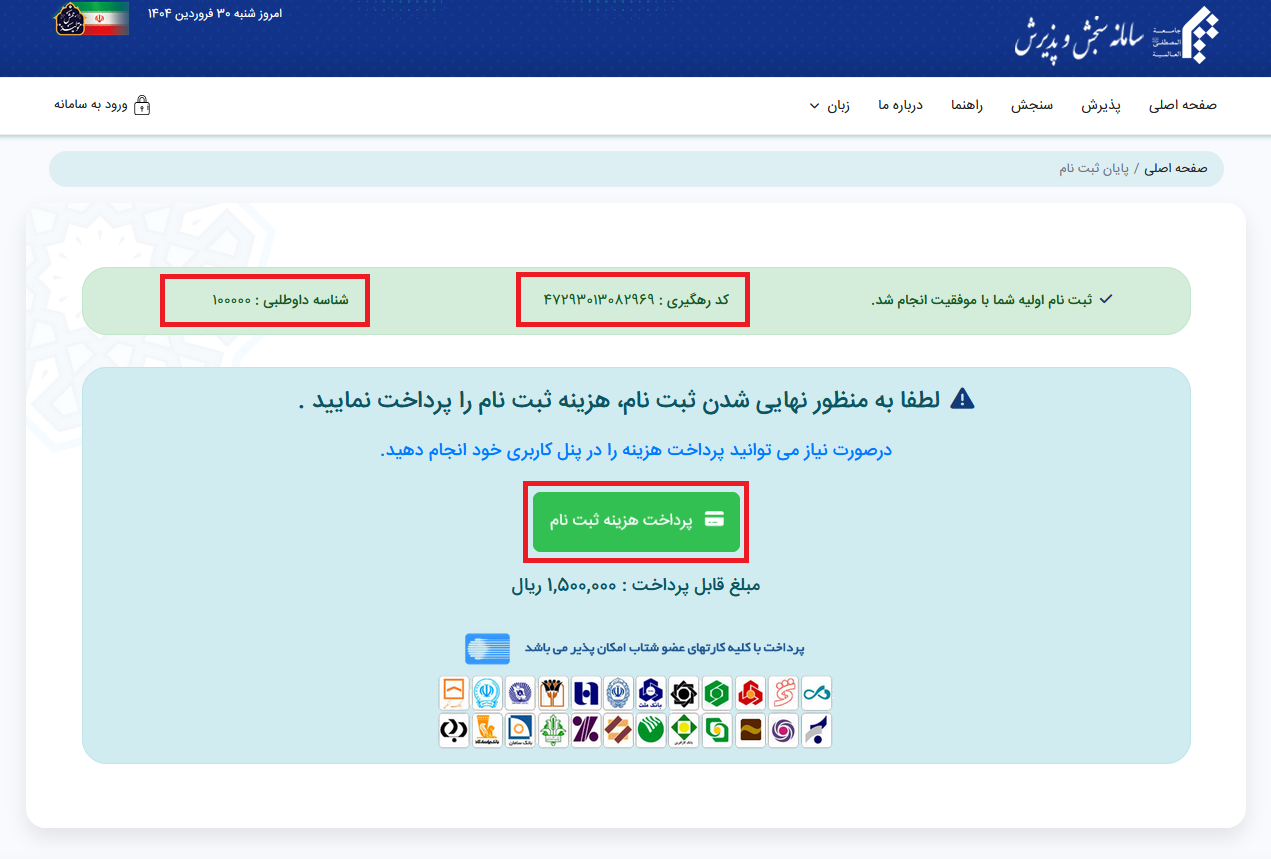 دقت داشته باشید در صورتی که هزینه ثبت نام را پرداخت نکنید ثبت نام شما قابل پیگیری نمی باشد و نمی توانید در آزمون ها شرکت کنید.