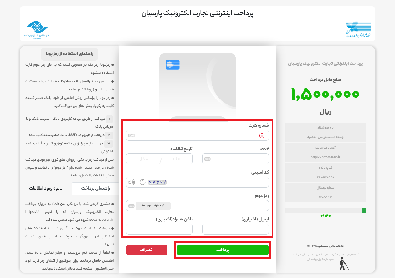 مرحله 15 : در صفحه پرداخت اطلاعات خواسته شده کارت بانکی خود را وارد کرده و روی دکمه پرداخت کلیک کنید.