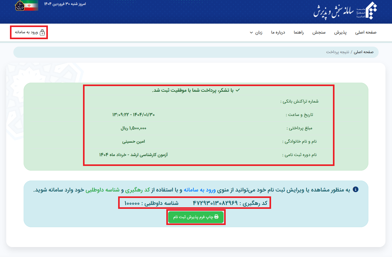 مرحله 16 : در صورت موفقیت آمیز بودن پرداخت وارد این صفحه می شوید. دقت داشته باشید به منظور پیگیری ثبت نام خود حتما روی گزینه چاپ فرم پذیرش ثبت نام کلیک کنید و فرم مربوطه را نزد خود نگه دارید.