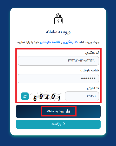 مرحله 17 : به منظور ورود به سامانه در این صفحه باید کد رهگیری و شناسه داوطلبی خود را وارد کنید و پس از وارد کردن کد امنیتی روی دکمه ورود به سامانه کلیک کنید.